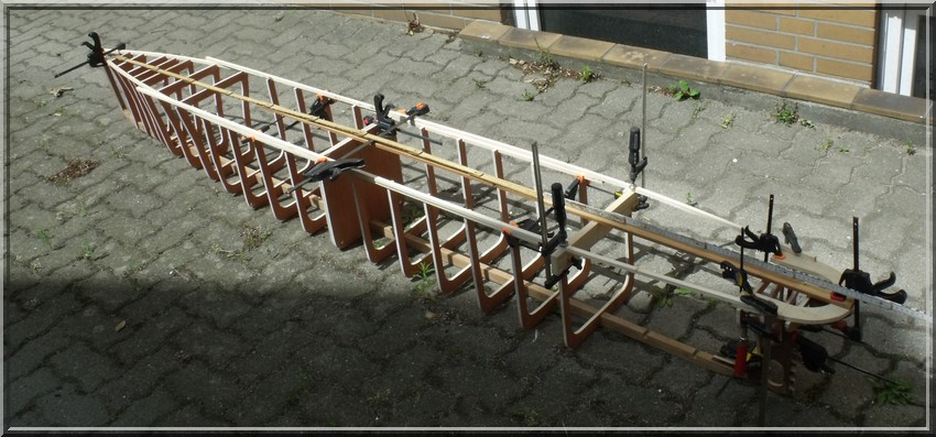 Wolfgang war wieder fleißig und hat nun die 26 Spanten ausgesägt und einen großen Teil davon schon in den Kiel eingearbeitet.