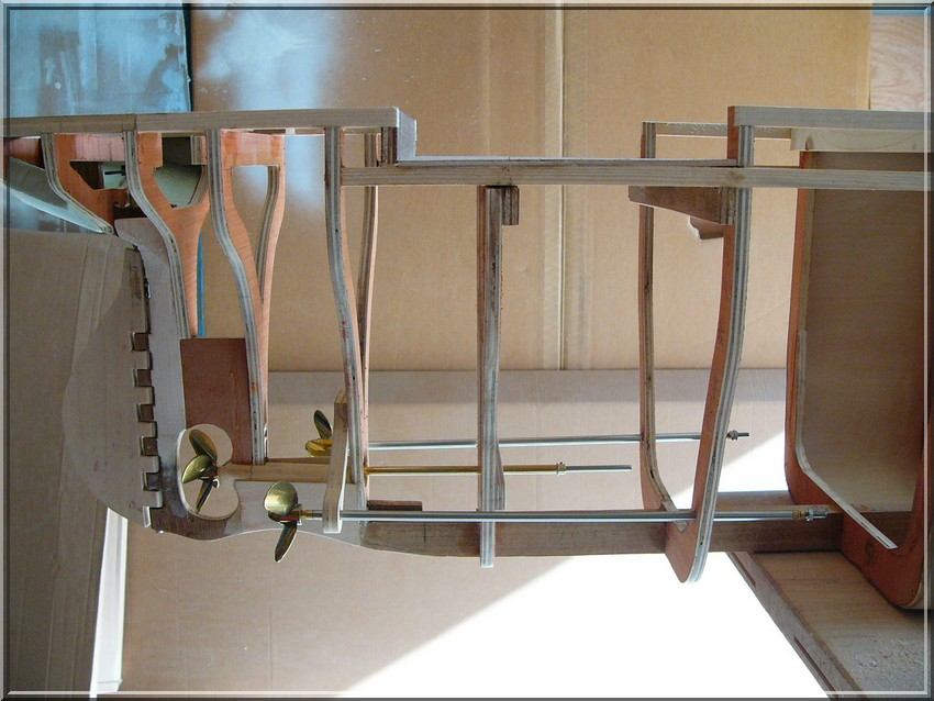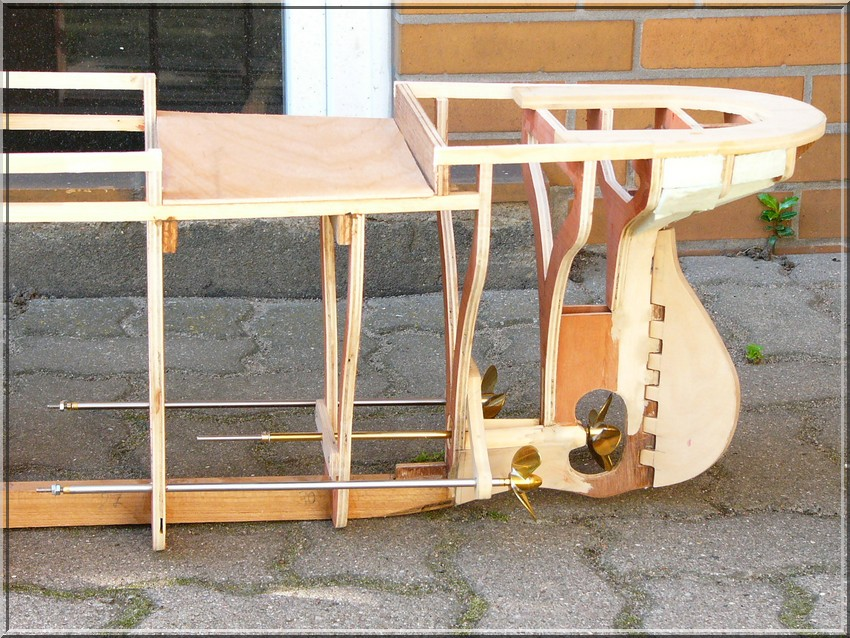 Auch das Heck mit Ruder und die Wellenböcke sind angebracht und Teile des Deck mit Sperrholz beschichtet.
